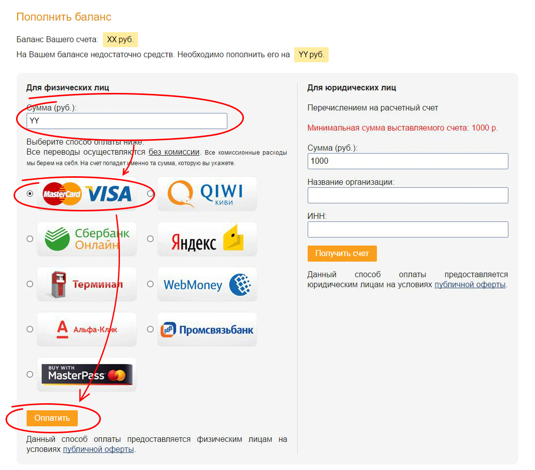Если же средств недостаточно, система предложит пополнить баланс. Размер недостающей суммы автоматически будет внесен в поле "Сумма", но Вы можете изменить его по желанию. После выбора способа оплаты (например, картой VISA / MASTERCARD) нажмите на кнопку "Оплатить".