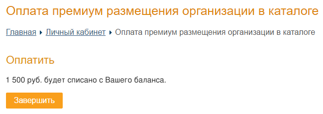 Следуйте инструкциям на сайте платежного шлюза (Яндекс.КАССА). При успешном завершении оплаты, указанная сумма переведется на Ваш баланс и будет использована оплаты/продления премиум страницы в каталоге организаций.